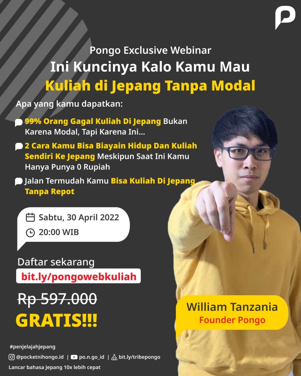 Halo selamat datang di Tribe Pongo, disini adalah tempat kamu yang ingin belajar Bahasa Jepang dengan teman teman satu tribe. Disini akan diadakan berbagai macam event seperti webinar, diskusi, QnA, dan banyak event menarik lainnya yang tentunya GRATIS untuk para member tribe ini ya!